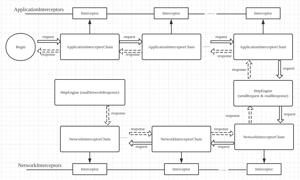 这里还有一点需要说明的是NetworkInterceptorChain是HttpEngine的内部类,它调用的readNetworkResponse方法实际上是HttpEngine.readNetworkResponse。现在我们就对OkHttp拦截器的请求流程和拦截器的实现原理有了比较全面的了解,下面这张图对整个流程做一个总结:
