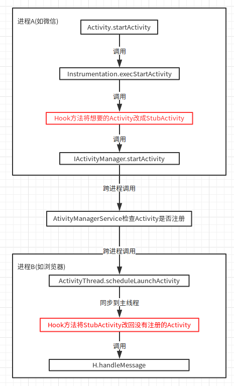 1 2 3 4 5 6 7 8 9 10 11 12 13 14 15 16 17 18 19 20 21 22 23 24 25 26 27 28 29 30 31 class MyActivityManager implements IActivityManager { private IActivityManager mOrigin; public MyActivityManager(IActivityManager origin) { mOrigin = origin; } public int startActivity(IApplicationThread caller, String callingPackage, Intent intent, String resolvedType, IBinder resultTo, String resultWho, int requestCode, int flags, ProfilerInfo profilerInfo, Bundle options) throws RemoteException { // TODO 将要启动的activity替换成StubActivity return mOrigin. startActivity(caller, callingPackage, intent, resolvedType, resultTo, resultWho, requestCode, flags, profilerInfo, options); } ... } Class c = Class.forName("android.app.ActivityManagerNative"); final Field field = c.getDeclaredField("gDefault"); field.setAccessible(true); Singleton<IActivityManager> proxy = new Singleton<IActivityManager>() { protected IActivityManager create() { return new MyActivityManager(field.get(null)); } }; field.set(null, proxy);