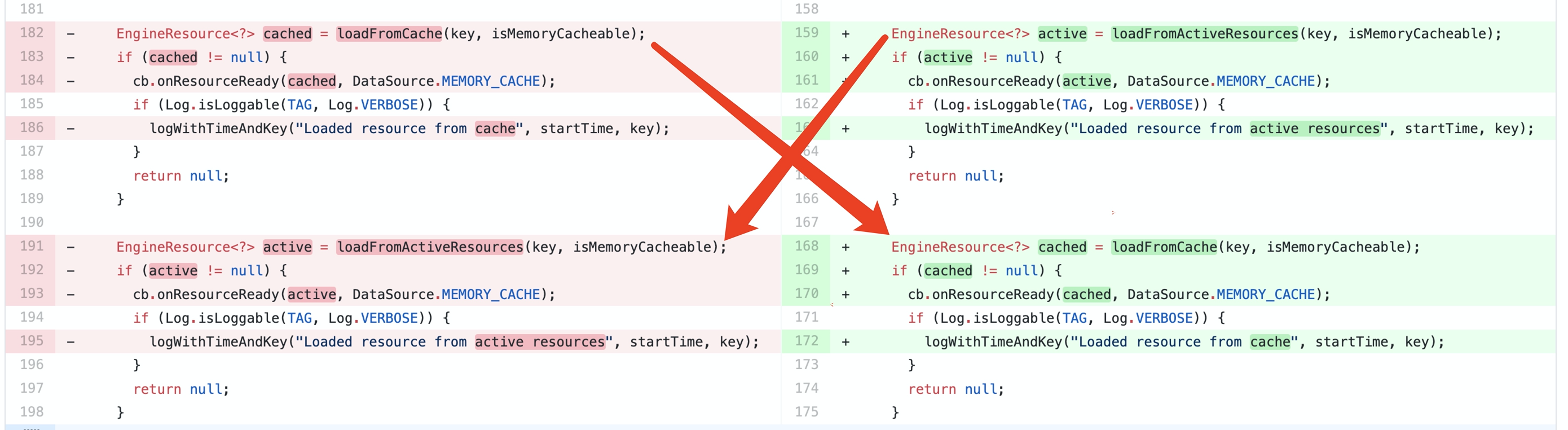 这个修改是为了修复资源被重复加载的bug,但实际上我看这部分修改的时候,感觉交换查询顺序应该和解这个bug没有直接关系,它更像是作者在重构之后觉得先查lru cache再查弱引用缓存的顺序怪怪的(我那个时候也有这种感觉),顺手改了下: