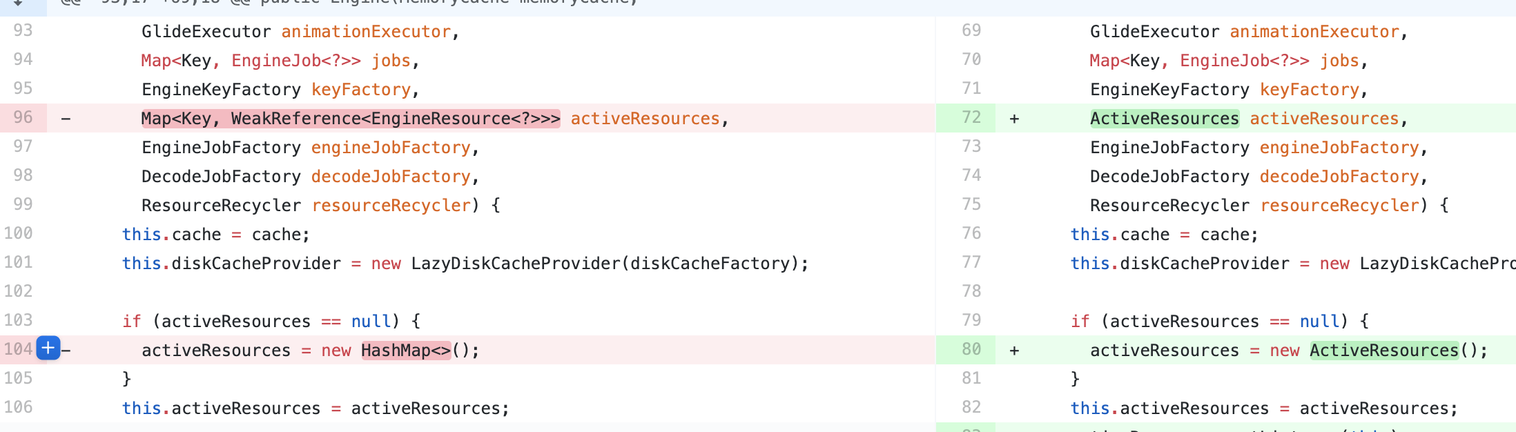 final class ActiveResources { ... final Map<Key, ResourceWeakReference> activeEngineResources = new HashMap<>(); ... synchronized EngineResource<?> get(Key key) { ResourceWeakReference activeRef = activeEngineResources.get(key); if (activeRef == null) { return null; }