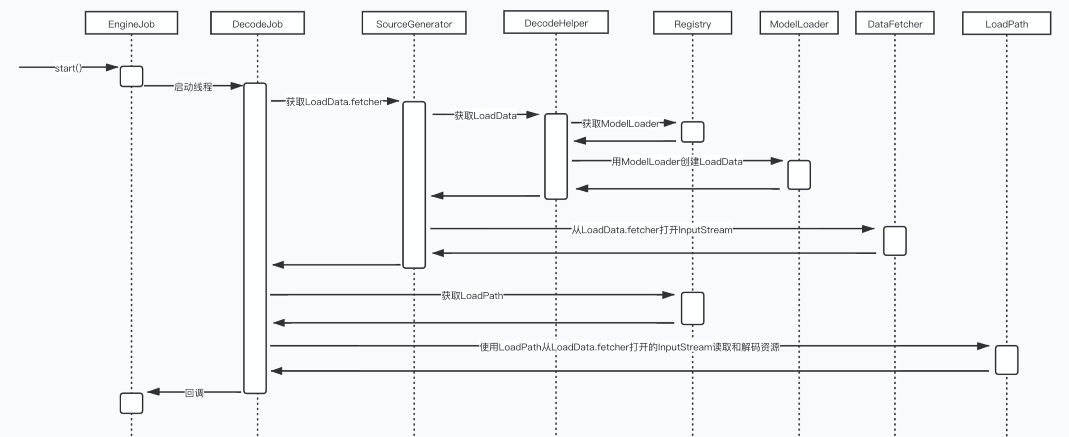 它最重要的功能是启动了DecodeJob去加载资源,DecodeJob是一个运行在子线程的Runnable。它会使用Generator去从缓存或者数据源加载数据,我们这次只看从数据源加载的SourceGenerator。