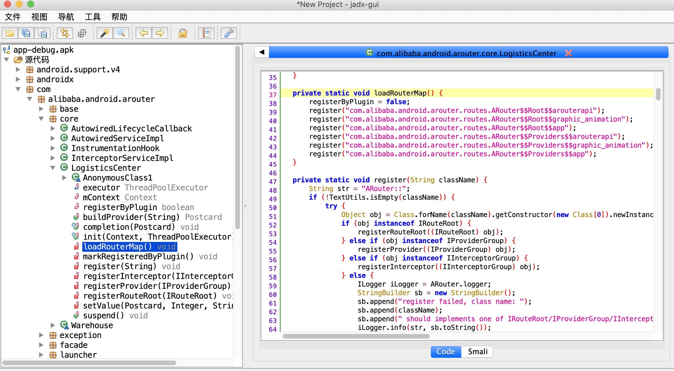 1 2 3 4 5 6 7 8 9 10 11 12 13 14 15 16 17 18 19 20 21 22 23 24 25 26 Set<String> routerMap; if (ARouter.debuggable() || PackageUtils.isNewVersion(context)) { routerMap = ClassUtils.getFileNameByPackageName(mContext, ROUTE_ROOT_PAKCAGE); if (!routerMap.isEmpty()) { context.getSharedPreferences(AROUTER_SP_CACHE_KEY, Context.MODE_PRIVATE) .edit() .putStringSet(AROUTER_SP_KEY_MAP, routerMap) .apply(); } PackageUtils.updateVersion(context); } else { routerMap = new HashSet <>(context.getSharedPreferences(AROUTER_SP_CACHE_KEY, Context.MODE_PRIVATE) .getStringSet(AROUTER_SP_KEY_MAP, new HashSet <String>())); } for (String className : routerMap) { if (className.startsWith(ROUTE_ROOT_PAKCAGE + DOT + SDK_NAME + SEPARATOR + SUFFIX_ROOT)) { ((IRouteRoot) (Class.forName(className).getConstructor().newInstance())).loadInto(Warehouse.groupsIndex); } else if (className.startsWith(ROUTE_ROOT_PAKCAGE + DOT + SDK_NAME + SEPARATOR + SUFFIX_INTERCEPTORS)) { ((IInterceptorGroup) (Class.forName(className).getConstructor().newInstance())).loadInto(Warehouse.interceptorsIndex); } else if (className.startsWith(ROUTE_ROOT_PAKCAGE + DOT + SDK_NAME + SEPARATOR + SUFFIX_PROVIDERS)) { ((IProviderGroup) (Class.forName(className).getConstructor().newInstance())).loadInto(Warehouse.providersIndex); } }