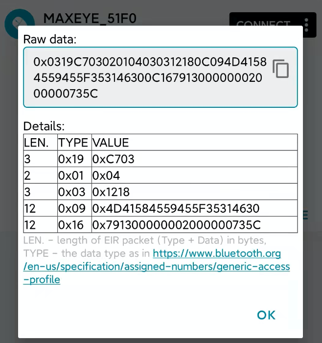 举个实际的例子,在手机上使用ble搜索应用搜索我司开发的蓝牙设备,查看其广播数据: