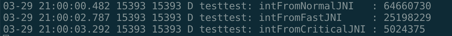 ... bool is_fast = false; // Notes about fast JNI calls: // // On a normal JNI call, the calling thread usually transitions // from the kRunnable state to the kNative state. But if the // called native function needs to access any Java object, it // will have to transition back to the kRunnable state. // // There is a cost to this double transition. For a JNI call // that should be quick, this cost may dominate the call cost. // // On a fast JNI call, the calling thread avoids this double // transition by not transitioning from kRunnable to kNative and // stays in the kRunnable state. // // There are risks to using a fast JNI call because it can delay // a response to a thread suspension request which is typically // used for a GC root scanning, etc. If a fast JNI call takes a // long time, it could cause longer thread suspension latency // and GC pauses. // // Thus, fast JNI should be used with care. It should be used // for a JNI call that takes a short amount of time (eg. no // long-running loop) and does not block (eg. no locks, I/O, // etc.) // // A '!' prefix in the signature in the JNINativeMethod // indicates that it's a fast JNI call and the runtime omits the // thread state transition from kRunnable to kNative at the // entry. if (*sig == '!') { is_fast = true; ++sig; } ... m->RegisterNative(fnPtr, is_fast); ... }