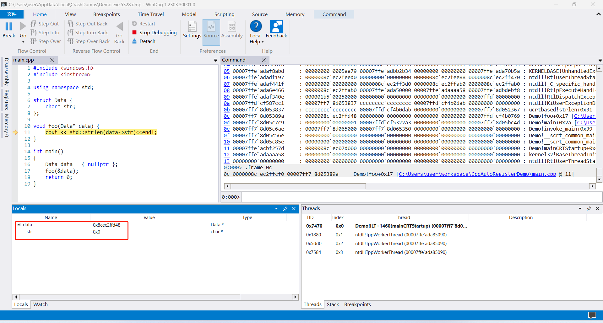 从Locals信息里面可以看到data这个指针的值是0x0000008cec2ffd48,而data->str的值则为0x0,所以我们就能定位出是data->str空指针导致strlen出现异常。