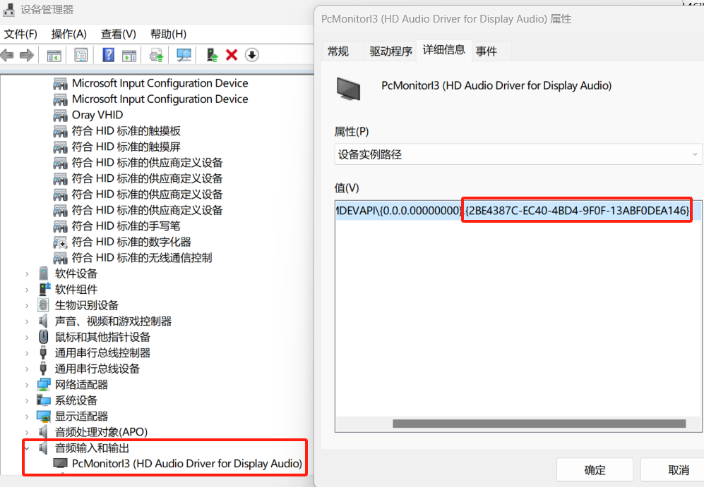 然后到注册表编辑器的计算机\HKEY_LOCAL_MACHINE\SOFTWARE\Microsoft\Windows\CurrentVersion\MMDevices\Audio\Render\下找到对应id然后在Properties里面将Manufacturer ID+Product Code信息删除接着插拔hdmi即可。