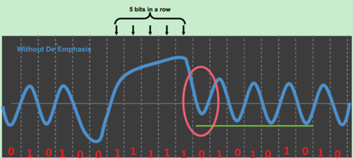 De-emphasis则是则是为了处理连续的1或者0对于后面信号跳变的影响,例如连续的1可能会让电压逐渐增加,而在接下来要变成0的时候减低的电压不足以达到标准的0的电压: