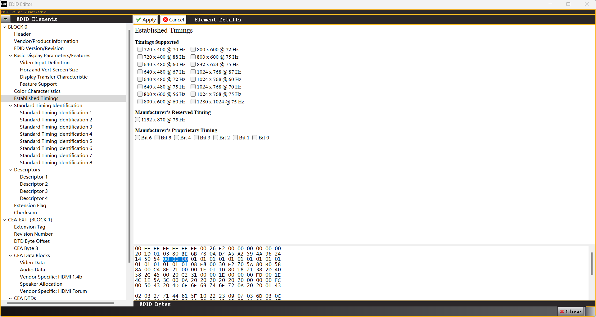它实际就是一个128字节(HDMI1.0~1.4)或者256字节(HDMI2.0+)的二进制数据,它里面每个bit都有对应的含义,可以在维基百科看到具体的定义。不过看了大概也记不住所以一般直接用可视化的编辑工具去编辑就好,编辑工具就会显示人可理解的信息出来。例如通过