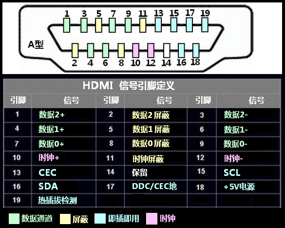 hdmi是啥我就不说了直接看看它的针脚定义,后面讲的内容都会基于它: