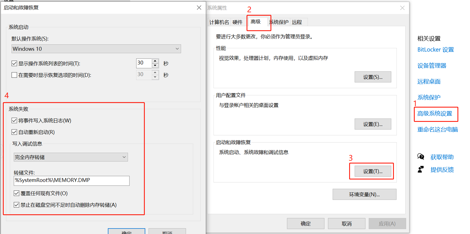 首先我们可以在”右键选中我的电脑->属性->高级系统设置->高级->启动和故障恢复设置->系统失败”里面设置蓝屏时候生成dump文件的一些逻辑: